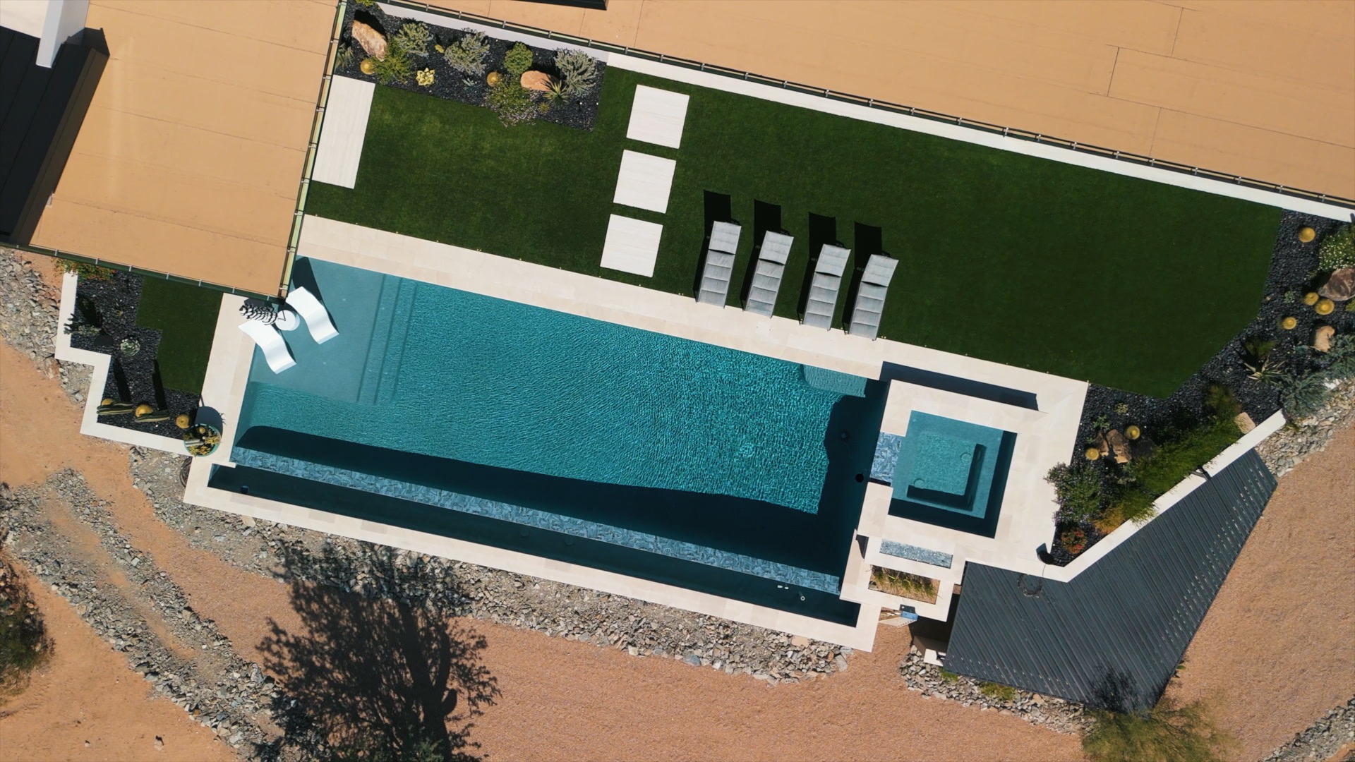 Materials are chosen for performance and beauty. A well balanced pebble finish brings texture that lasts while staying comfortable underfoot. Waterline tile is selected to resist mineral buildup, and coping stays cooler in July without losing character. Equipment is tuned for the desert with variable speed pumps for efficiency and in-floor cleaning that lifts dust before it settles. An autofill balances evaporation, and an overflow keeps surprise summer rain in check.